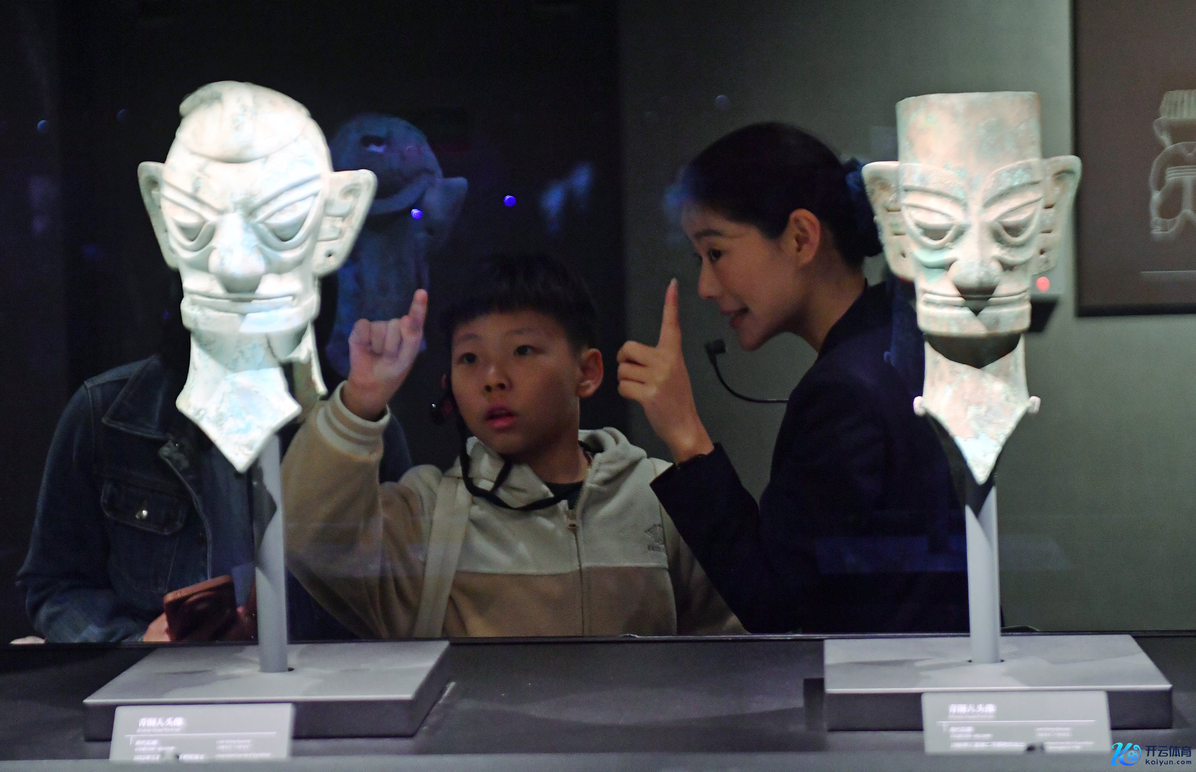 4月3日,教授员在三星堆博物馆为旅客教授展品。