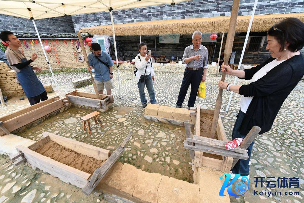 4月9日,旅客在福建土楼(南靖)景区的土楼之光文化园体验客家土楼营造武艺。新华社记者 林善传 摄