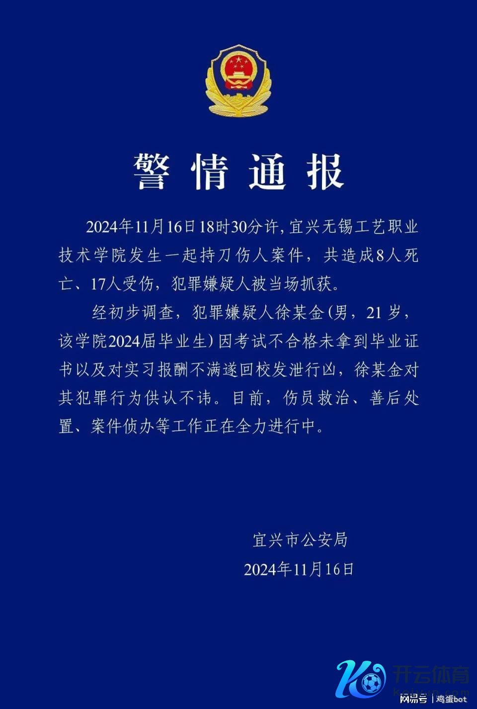 11月16日18时许,江苏宜兴无锡工艺行状手艺学院发生一都持刀伤东说念主案件,已致8东说念主牺牲、17东说念主受伤九游体育娱乐网,激发情态。