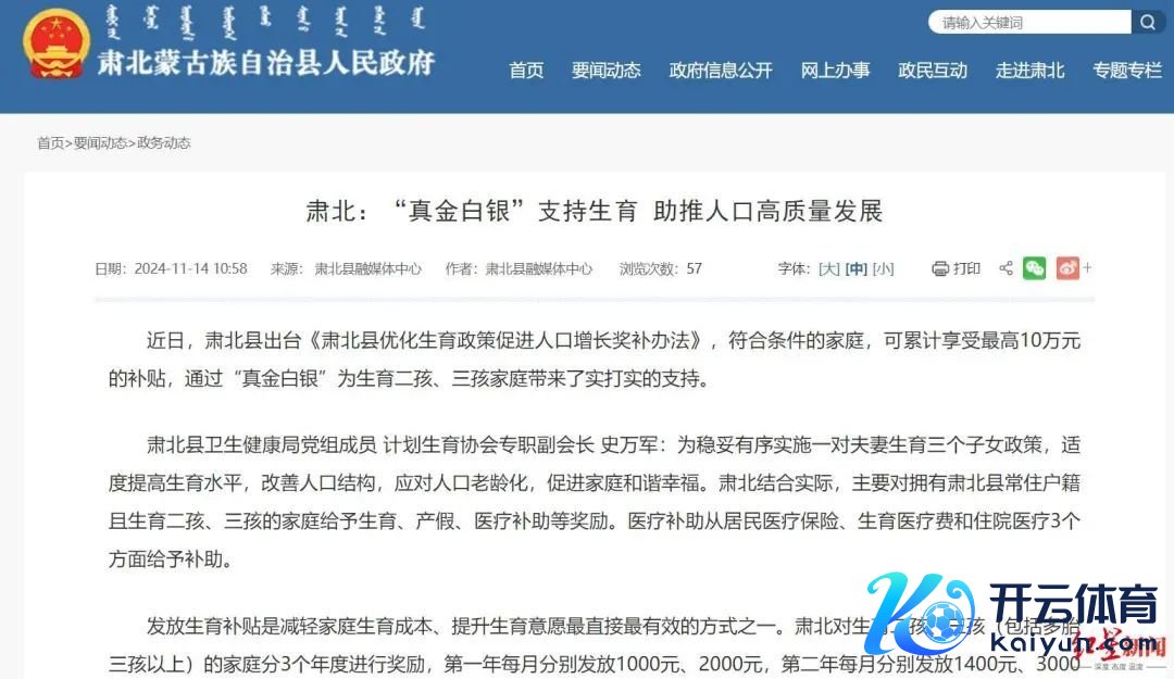 11月14日,肃北县政府官网发布的一篇著作称,肃北县近日出台《肃北县优化生养战术促进东谈主口增长奖补办法》(下称《奖补办法》),相宜要求的家庭可累计享受最高10万元的补贴,通过“真金白银”为生养二孩、三孩家庭带来了实打实的赞成。