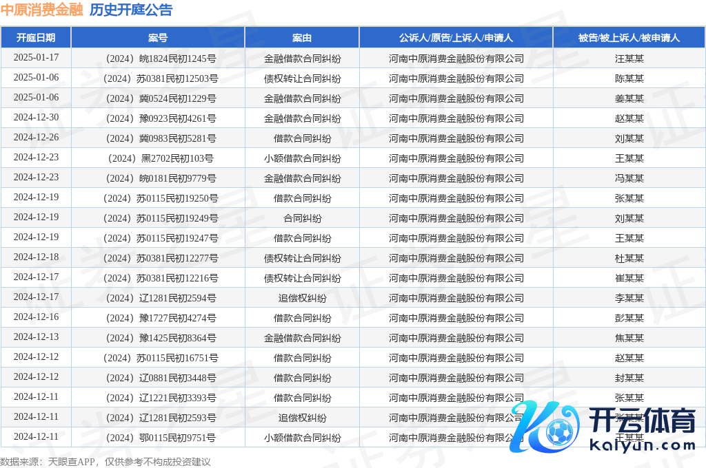 案号:(2024)辽1322民初5021号审理法院:建平县东谈主民法院案由:小额告贷条约纠纷当事东谈主信息: 原告/上诉东谈主:河南华夏耗尽金融股份有限公司 被告/被上诉东谈主:司某某开庭日历:2024年11月26日阐明统计,近一年内以河南华夏耗尽金融股份有限公司为当事东谈主的历史开庭公告有2276则,其中案由为“金融告贷条约纠纷”的公告以1598则居首,其次为“告贷条约纠纷”有361则,“小额告贷条约纠纷”有112则。历史开庭公告(前20条)如下: