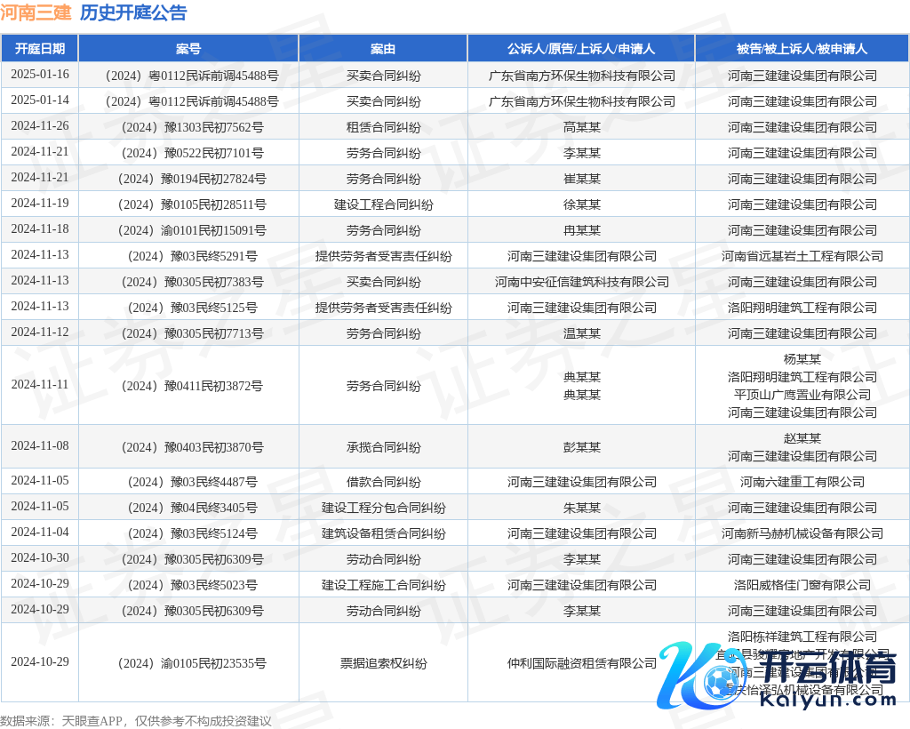 案号:(2024)豫1303民初7562号审理法院:南阳市卧龙区东说念主民法院案由:租出条约纠纷当事东说念主信息: 原告/上诉东说念主:高某某 被告/被上诉东说念主:河南三建确立集团有限公司开庭日历:2024年11月26日字据统计,近一年内以河南三建确立集团有限公司为当事东说念主的历史开庭公告有59则,其中案由为“劳务条约纠纷”的公告以14则居首,其次为“贸易条约纠纷”有12则,“提供劳务者受害牵扯纠纷”有4则。历史开庭公告(前20条)如下: