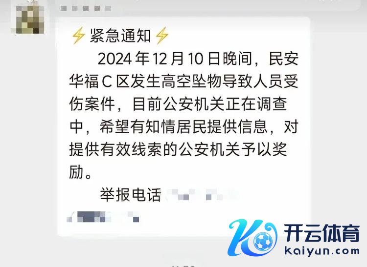 “2024年12月10日晚间,民安华福C区发生高空坠物导致东说念主员受伤案件,现在公安机关正在看望中,但愿有知情住户提供信息,对提供灵验陈迹的,公安机关赐与奖励。”日前,这么一则伏击奉告在网高尚传开来,激勉口头。