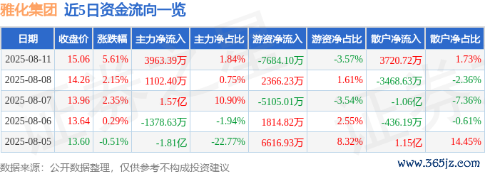 本站音信,放胆2025年8月11日收盘九游体育app娱乐,雅化集团(002497)报收于15.06元,高潮5.61%,换手率13.55%,成交量143.44万手,成交额21.54亿元。