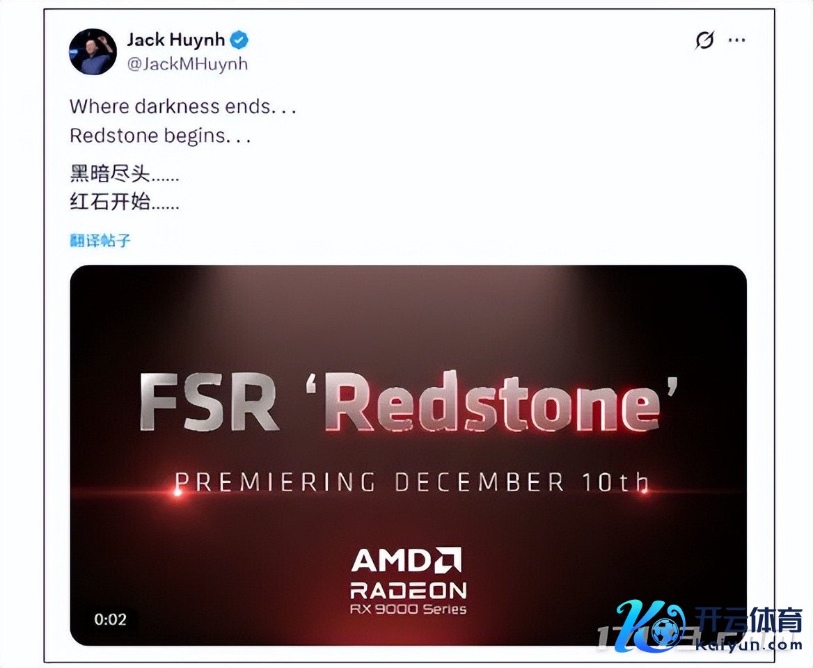 AMD计较与图形功绩部的高等副总裁兼总司理Jack Huynh,于酬酢媒体平台发布了官方预报,明确暗示FSR Redstone更新已万事俱备,且定于12月10日肃穆与全球碰头。
