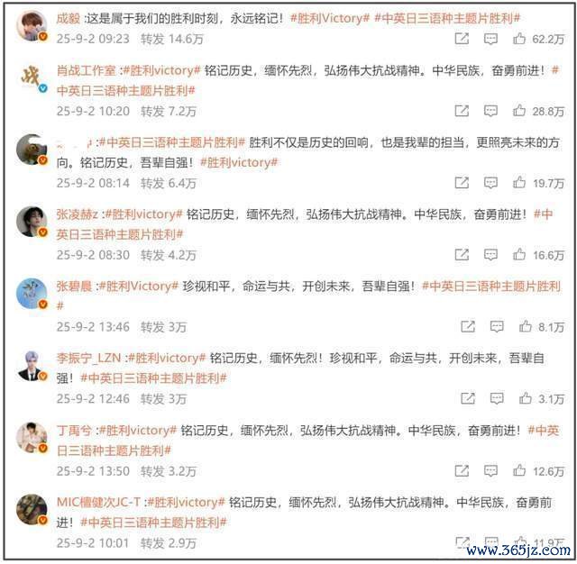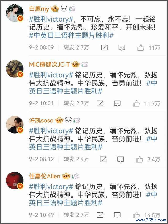 适值九三考订前夜,内娱明星意气轩昂纷繁转发关系博文庆祝抗战告捷,其中台湾省明星尤其受选藏,因为许多明星永久在内地发展,是以天然需要表态。