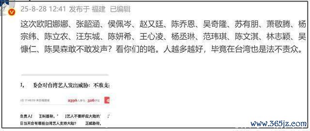不知说念是不是屡次合营转发被在意,致使被“盯上”的缘起。9月2日的全明星转发抗战告捷威望里,实在莫得台湾省艺东说念主的身影,就连一向积极的张韶涵和欧阳娜娜等着名艺东说念主都纷繁缺席。