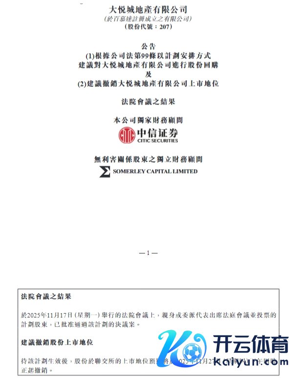 具体来看,公告清晰,大悦城地产于2025年10月24日发布的规划文献,本体酌量字据公国法第99条以规划安排相貌建议对本公司进行股份回购及建议湮灭本公司上市地位。于2025年11月17日(星期一)举行的法院会议上,切身或委托代表出席法庭会议并投票的规划鼓吹,已批准通过该规划的有蓄意案。建议湮灭股份上市地位待该规划收效后,股份于联交所的上市地位预期将于2025年11月27日(星期四)下昼四时正起湮灭。