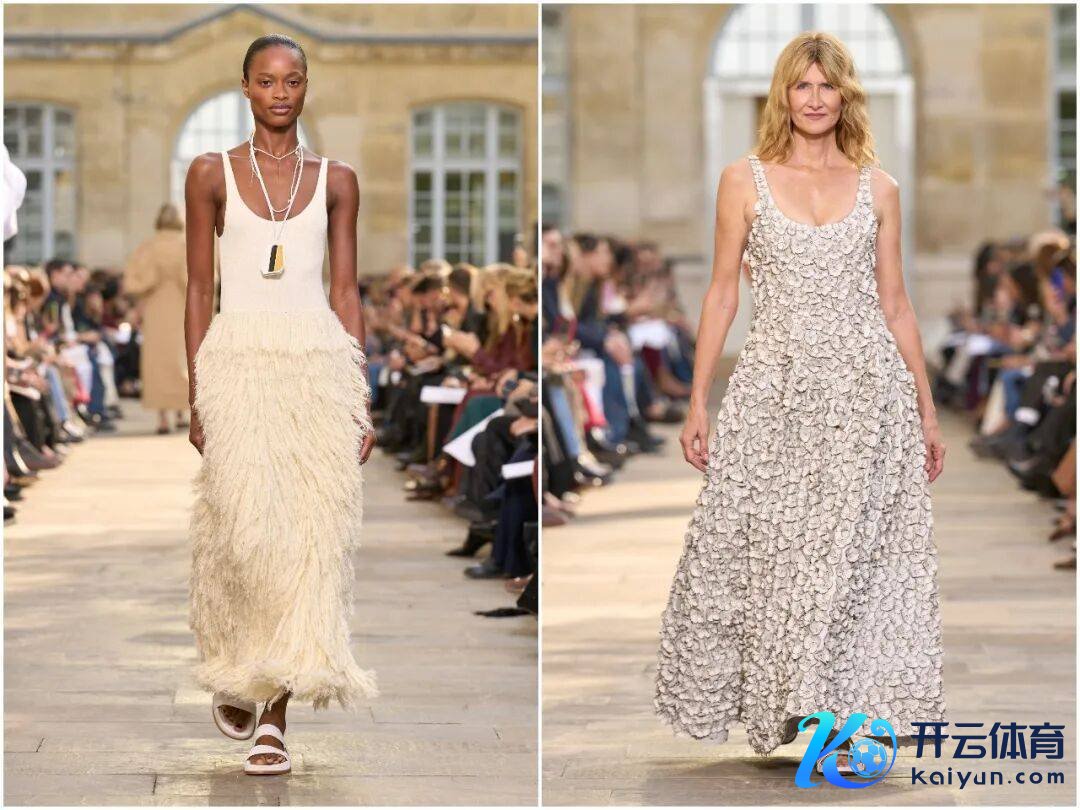 大秀以奥斯卡影后Laura Dern的压轴式开场冲突宁静。她身着“女皇”牌主题造型,一袭象牙白皮革长裙,缀满2500朵手工缝制皮革花草,从裙摆扩展至领口,重重叠叠如春日盛放的玫瑰园。这组造型不仅是视觉盛宴,更精确解释了“女皇”所代表的丰饶、创造力与母性巨擘,Dern的千里稳气场与服装的柔好意思质感无缺会通,陡然将现场带入机密的塔罗氛围。